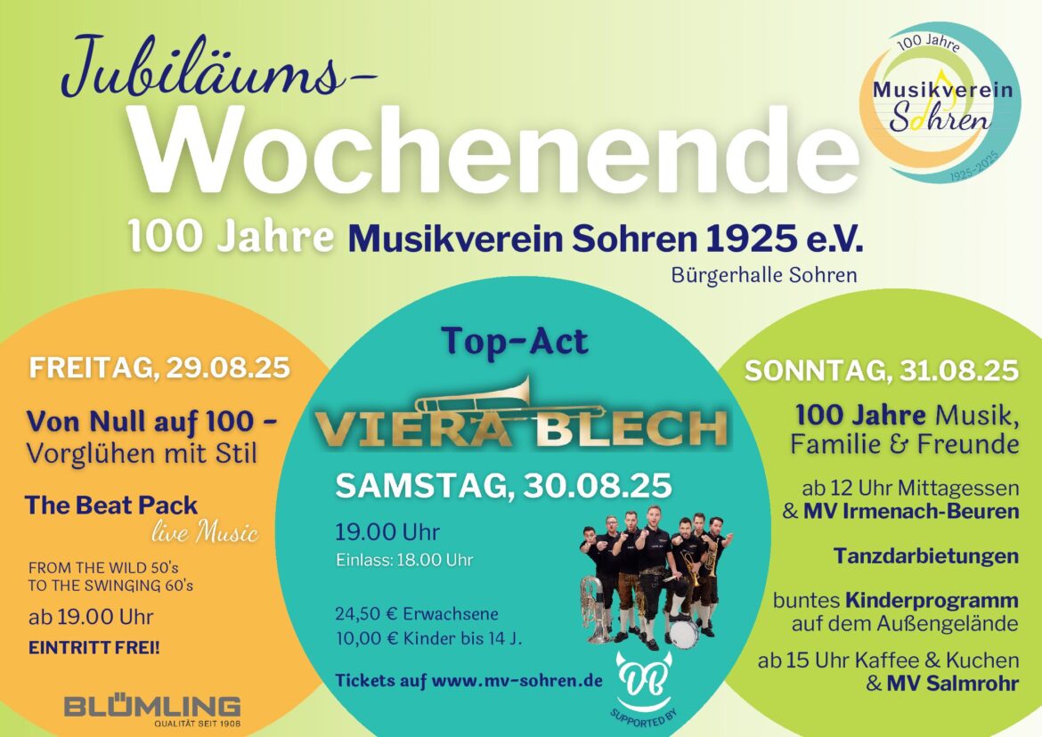 Im Rahmen seines 3-tägigen Jubiläumsfestes folgt am Samstag, 30.08.25 dann der große musikalische Höhepunkt: Die gefeierte Blasmusikformation Viera Blech steht ab 19 Uhr auf der Bühne der Sohrener Bürgerhalle. Virtuos, energiegeladen und mitreißend – diese Band begeistert Fans in ganz Europa. Darüber hinaus liefert an diesem Abend auch die regional ansässige Vorband DeiwelsBlech „teuflisch gute Blasmusik aus dem Hunsrück“ und wird dem Publikum vorab kräftig einheizen.